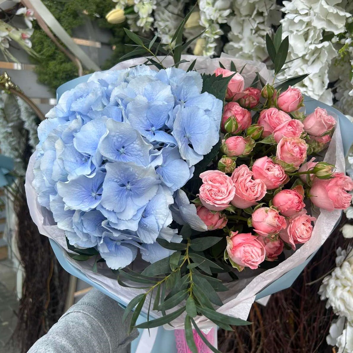 Сказочный букет из 4 веток кустовой розы, 3 штуки пышной гортензии в