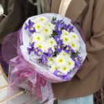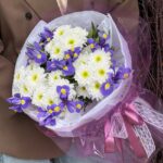 Оригинальный букет состоит из 9 ирисов и 4 веточек белой хризантемы с добавлением зелени.