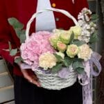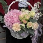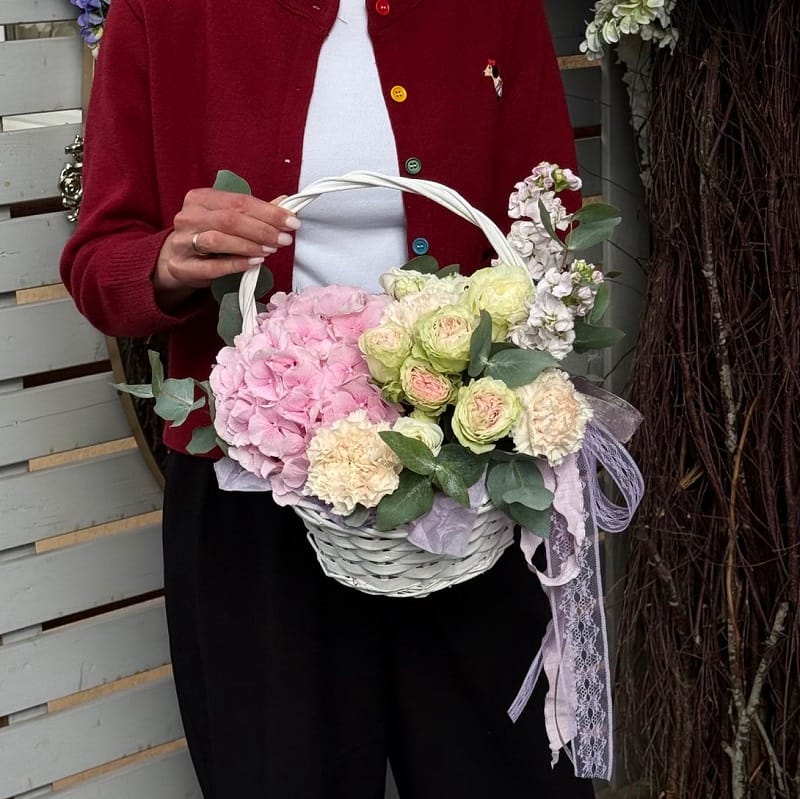 Милая корзинка из гортензии, 2 веток маттиолы, 2 ветки кустовой розы разных