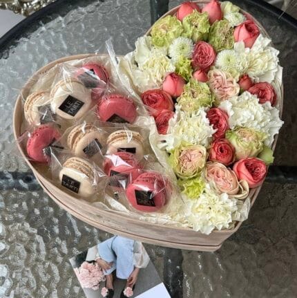 Эта яркая цветочная корзина состоит из 7 веточек кустовой розы, 5 розовых