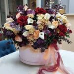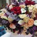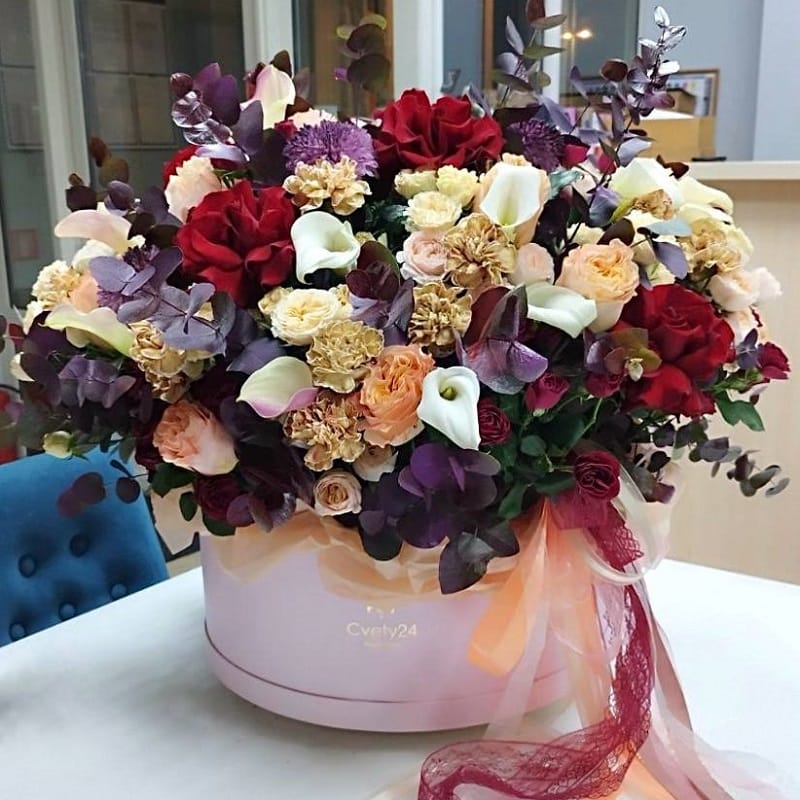 состоит из 9 хризантемы одноголовой, 7 французской розы, 10 веток кустовой розы рэд лейс, 23 веток кустовой пионовидной розы двух оттенков, 17 классических одноголовых роз, 20 калл, 23 гвоздики с добавлением декоративной зелени.