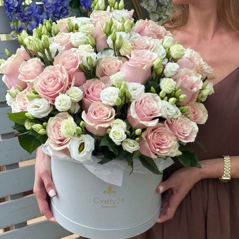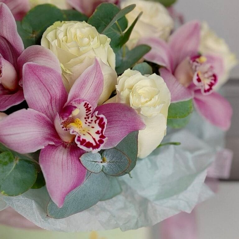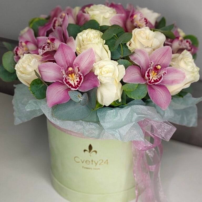 Композиция в шляпной коробке из тюльпанов "Летний сад"